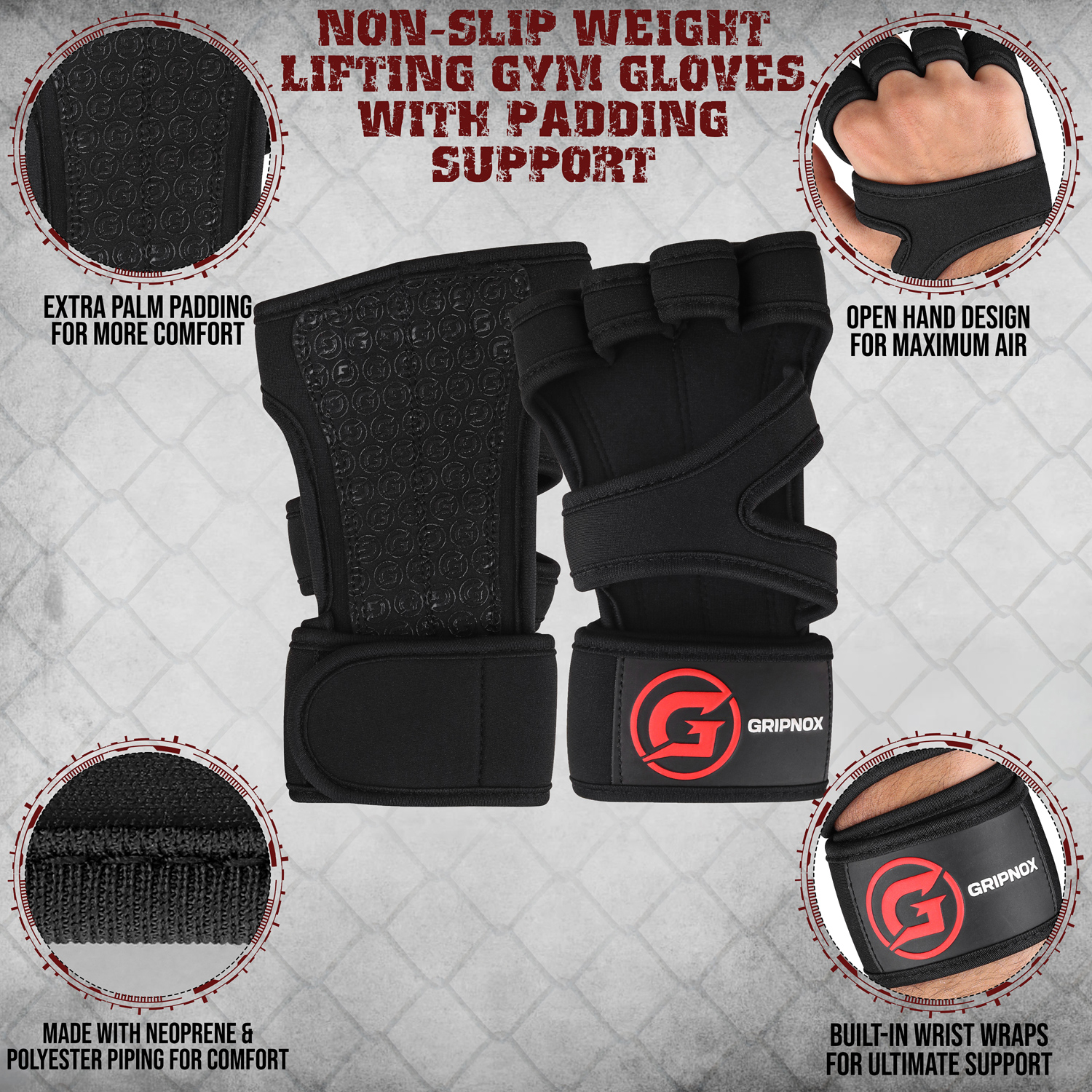 GRIPNOX Open-Hand Ventilated Gym Gloves – Black