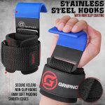 Heavy-duty lifting hooks with padded wrist support for secure bar attachment.